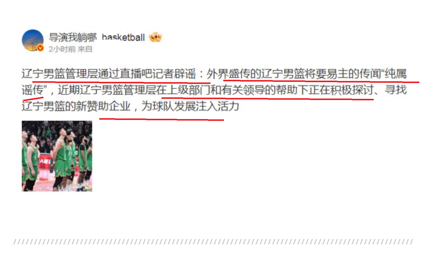 辽宁队管理层人员:目前,辽宁队没有要出售的计划,现阶段,球队正在寻求新的赞助商,为球队注入新动力!